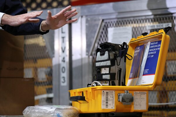New York City Mayor Bill de Blasio shows off a ventilator during a press conference in New York on March 24, 2020.CAITLIN OCHS/Reuters
