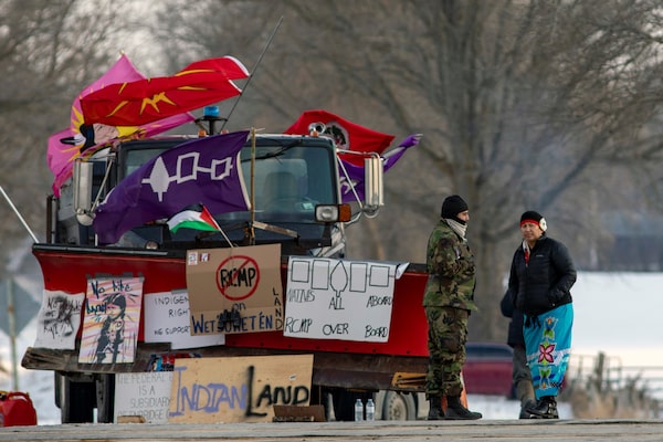 Two people have a conversation at the site of a rail stoppage on Tyendinaga Mohawk Territory, as part of a protest against British Columbia's Coastal GasLink pipeline, in Tyendinaga, Ontario, Canada, Feb. 16, 2020. The Liberal approach to what has turned into the greatest domestic crisis since Mr. Trudeau became Prime Minister is, to put it charitably, baffling.CARLOS OSORIO/Reuters