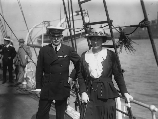 Irish explorer Sir Ernest Shackleton (1874-1922) and his wife Lady Emily Shackleton on board SS Endurance at Millwall Docks, London, England before leaving for the Antarctic, 1914.Topical Press Agency/Getty Images