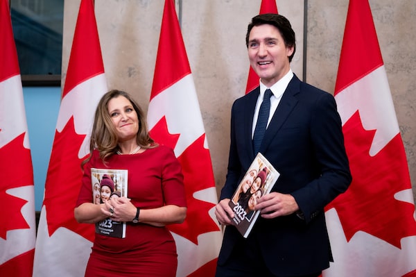 Deputy Prime Minister and Minister of Finance Chrystia Freeland, left, and Prime Minister Justin Trudeau take part in a photo opportunity during the Fall Economic Statement on Parliament Hill in Ottawa, on Nov. 21, 2023.Spencer Colby/The Canadian Press