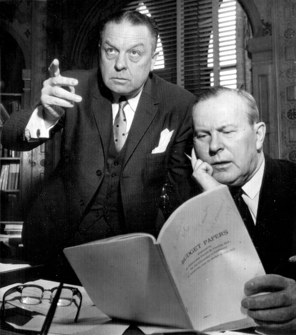 Federal Liberal leader Lester Pearson, right, and Liberal defence critic William Benidickson look over budget papers at a meeting in 1962, when the Liberals were in opposition.The Canadian Press