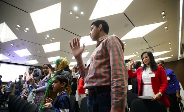 Muhammad Huzaifa Khalid, a Pakistani immigrant, takes the citizenship oath on Parliament Hill on April 17, 2019, at a ceremony marking the 37th anniversary of the Canadian Charter of Rights and Freedoms.Sean Kilpatrick/The Canadian Press