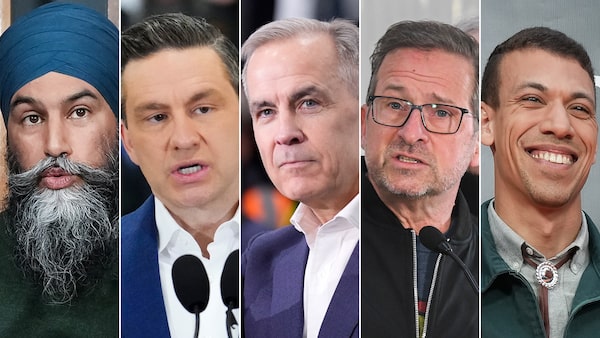 This composite image shows, left to right, NDP Leader Jagmeet Singh on March 25, 2025; Conservative Leader Pierre Poilievre on April 3, 2025; Liberal Leader Mark Carney on April 1, 2025; Bloc Quebecois Leader Yves-Francois Blanchet on March 28, 2025 and Green Party co-leader Jonathan Pedneault on March 30, 2025. (THE CANADIAN PRESS/Nathan Denette, Sean Kilpatrick, Adrian Wyld, Graham Hughes, Ethan Cairns)The Canadian Press