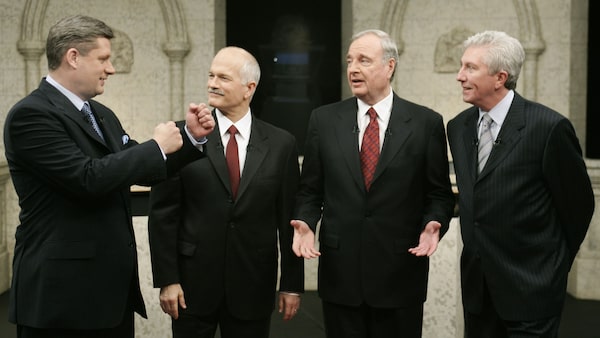 Conservative leader Stephen Harper mockingly gets his dukes up at a 2005 debate with the NDP's Jack Layton, the Liberals' Paul Martin and the Bloc Québécois's Gilles Duceppe.Paul Chiasson/The Canadian Press/CP