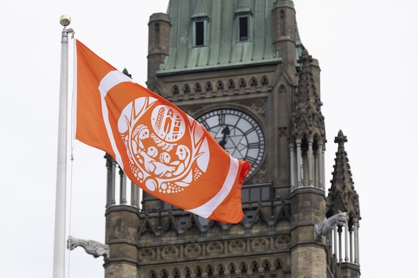 The flag honouring residential school survivors features a family encircled by a cedar branch, eagle feather, Métis sash and inuksuit, as well as seeds nestled below ground, which are meant to represent the spirits of the children who did not return home from residential schools.Adrian Wyld/The Canadian Press