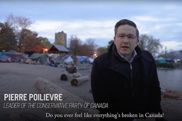 Mr. Poilievre’s video features him sitting on a downtown Vancouver beach with a tent community behind him.