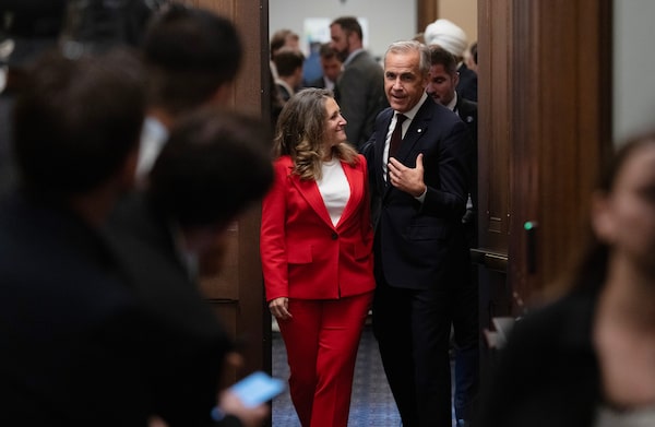 Prime Minister Mark Carney with then-cabinet minister Chrystia Freeland in September in Ottawa. Ms. Freeland says she'll be resigning from Parliament in the 'coming weeks,' a move that will trigger a by-election in her Toronto riding.Adrian Wyld/The Canadian Press