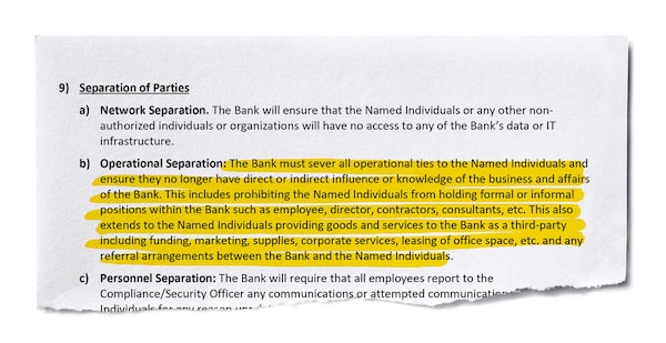 The bank’s staff are also required to report “any communications or attempted communications” by the three shareholders “for any reason unrelated to compliance with these terms and conditions.”