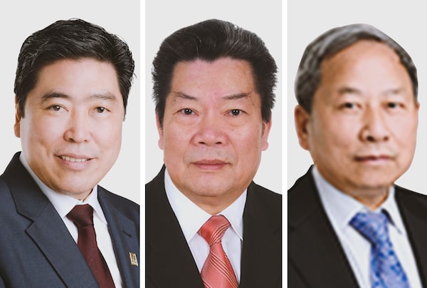 Insurance executive Shenglin Xian, left, grocery tycoon Yuangsheng Ou Yang, and property developer Morris Chen, right, were ordered to sell their shares in Wealth One Bank. The bank, founded in 2016 and based in Toronto, caters to Chinese-Canadian clients.Supplied