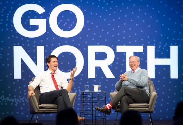 Prime Minister Justin Trudeau shares a laugh with Executive Chairman of Alphabet Inc. Eric Schmidt at the Google Go North conference at the Evergreen Brickworks in Toronto on Nov. 2, 2017.Frank Gunn/The Canadian Press