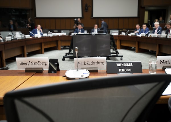 An empty chair sits behind the name tags for Facebook's Mark Zuckerberg and Sheryl Sandberg as the International Grand Committee on Big Data, Privacy and Democracy is set to begin in Ottawa, May 28, 2019.Adrian Wyld/The Canadian Press