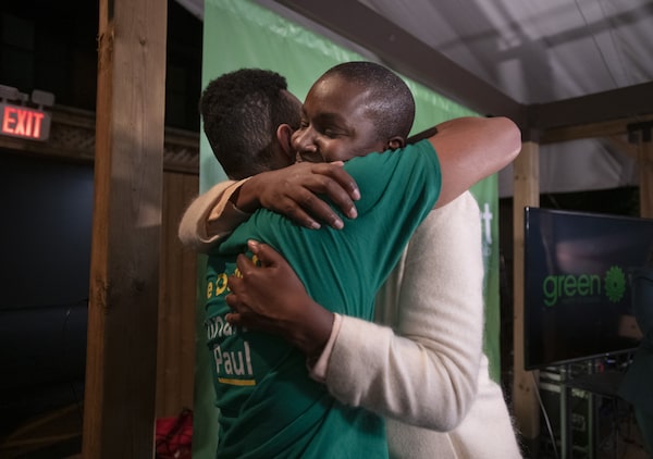 Annamie Paul, leader of the federal Green Party, embraces her son Malachai, after speaking to supporters on Sept 20, 2021.Fred Lum/the Globe and Mail
