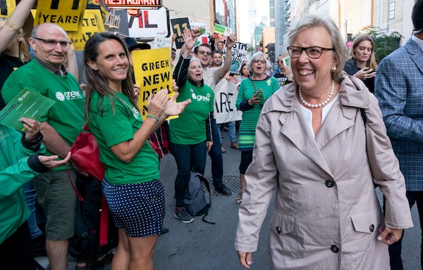 Green Party Leader Elizabeth May greets supporters as she arrives for the first federal election debate in Toronto on Sept. 12, 2019.Paul Chiasson/The Canadian Press