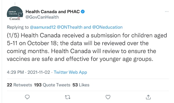 “The tweet was indeed an error (both in content and the fact that it was posted as a reply to a old tweet) and therefore was taken down,” Mr. Morrissette said in a statement. He added that comments made last week by Health Canada’s Chief Medical Adviser, Supriya Sharma, are still the most accurate information about when Canadian children will be able to get their shots.