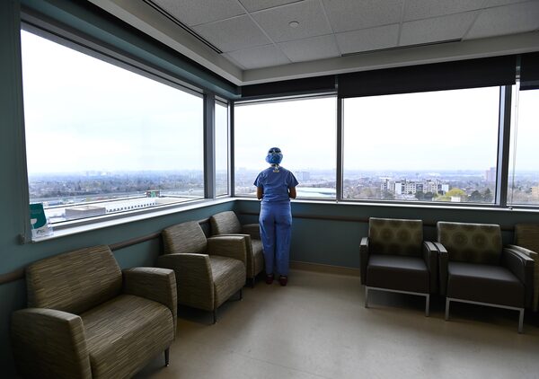 Registered nurse Stephanie Flores, who has been redeployed from the operating room to the intensive care unit, looks out the window in the ICU at the Humber River Hospital during the COVID-19 pandemic in Toronto on April 13, 2021.Nathan Denette/The Canadian Press