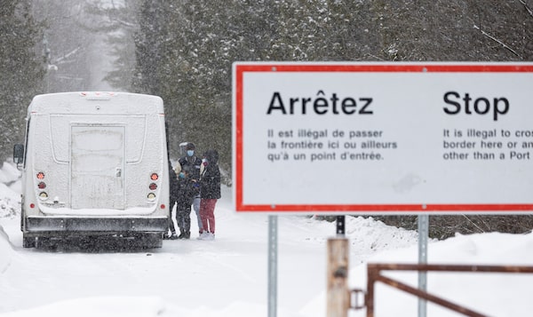 Asylum seekers board a bus after crossing into Canada from the U.S. in Champlain, N.Y., on Feb. 28.CHRISTINNE MUSCHI/Reuters