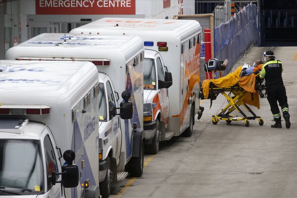 Paramedics wheel a patient past ambulances outside a Toronto hospital in early January, 2022. Theresa Tam, Canada's Chief Public Health Officer, told a virtual press conference Friday, Jan. 14 that the peak of the Omicron wave may be in sight, though modelling suggests hospitalizations will still rise.Chris Young/The Canadian Press