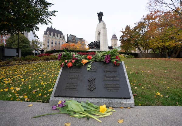 Flowers lie on the plaque commemorating Cpl. Nathan Cirillo in Ottawa, on Oct. 22.Adrian Wyld/The Canadian Press