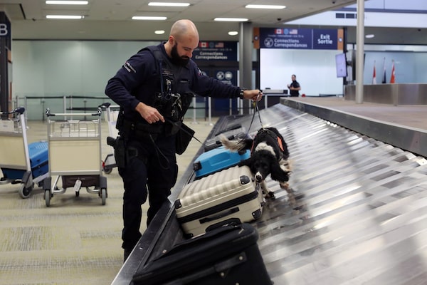 At Ottawa airport, suspects identified by Shakira are escorted to a warren of rooms on the first floor for further inspections, scanning and questioning, while the canine detection officer gets her reward.