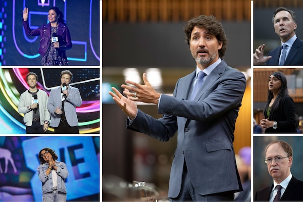 Some of the names to know in the WE Charity affair surrounding Prime Minister Justin Trudeau, middle, include his wife, Sophie Grégoire Trudeau, top left; the Kielburger brothers, middle left; Mr. Trudeau's mother Margaret Trudeau, bottom left; Finance Minister Bill Morneau, top right; Inclusion and Youth Minister Bardish Chagger, middle right; and Privy Council Clerk Ian Shugart, bottom right.Getty Images, The Canadian Press