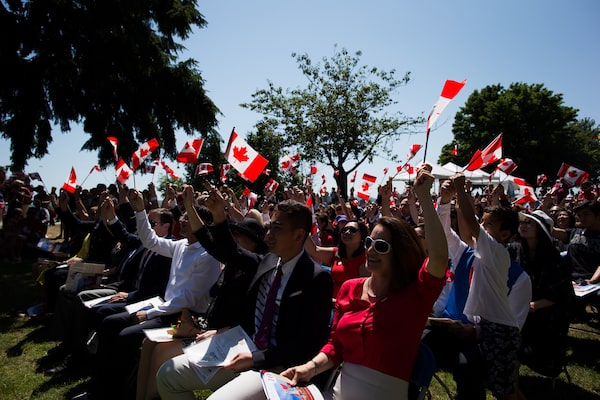 New Canadians, including Zahra Aminmoghaddam, front right, from Iran, wave flags after taking the oath of citizenship during a special Canada Day ceremony in West Vancouver on July 1, 2017.DARRYL DYCK/The Canadian Press