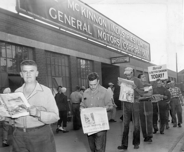 Striking workers at McKinnon Industries – a GM affiliate in St. Catharines, Ont. – read early editions of The Globe for updates on the negotations in 1955. The Globe's labour coverage had greatly expanded in the years since the Oshawa strike.Jimmy Simpson/The Globe and Mail