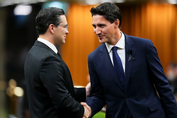 Prime Minister Justin Trudeau and Conservative leader Pierre Poilievre greet each other as they gather in the House of Commons on Parliament Hill to pay tribute to Queen Elizabeth in Ottawa on Sept. 15.Sean Kilpatrick/The Canadian Press