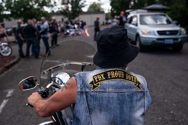 Flip Todd, a leader of the Portland Proud Boys, rides through a Proud Boy gathering in Gladstone, Oreg., on July 16.Nathan Howard/Getty Images
