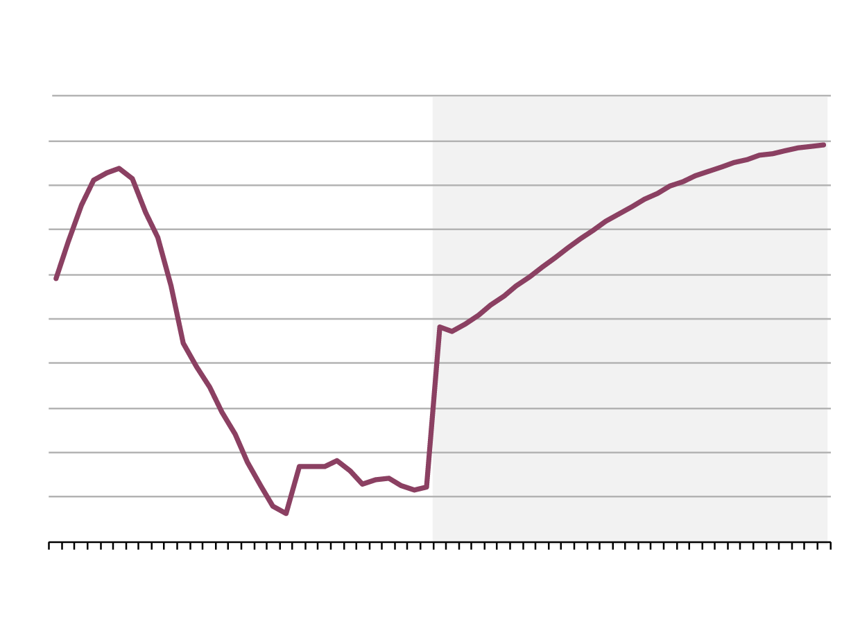 Canada federal debt as a percentage of GDP, 1990-2050