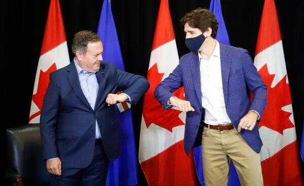 Prime Minister Justin Trudeau elbow bumps with Alberta Premier Jason Kenney in Calgary, Alta., on July 7.Jeff McIntosh/The Canadian Press
