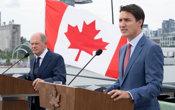 Prime Minister Justin Trudeau responds to a question next to German Chancellor Olaf Scholz during a news conference in Montreal on on Aug. 22.Paul Chiasson/The Canadian Press