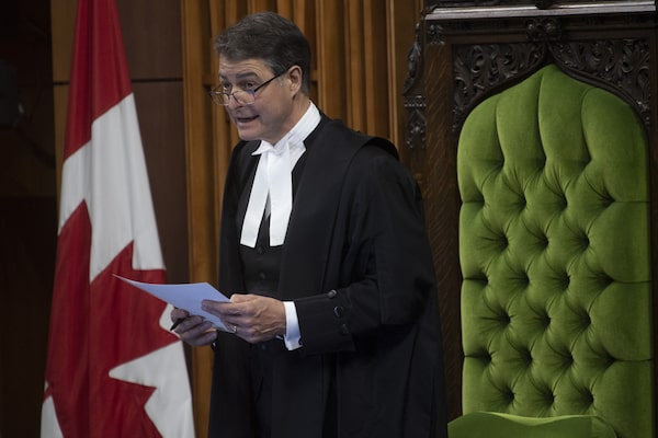 He put on a show of being dragged reluctantly to the Speaker’s chair, with Prime Minister Justin Trudeau holding one arm and Conservative Leader Erin O’Toole holding the other – a ritual that dates back centuries to the days when a Speaker in the British House of Commons risked execution by delivering unpleasant messages from the House to the monarch.