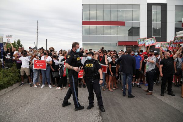 Dozens of demonstrators gathered at the event that was to be held in the parking lot of a hotel in Bolton, Ont., about 50 kilometres northwest of Toronto.CARLOS OSORIO/Reuters