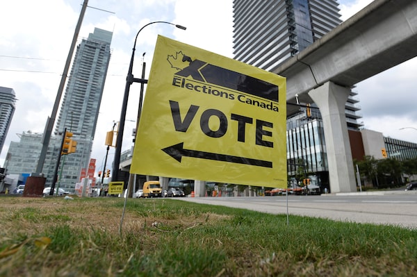 A sign outside an advance polling station in Burnaby, B.C., September 10, 2021 .The five-day poll, conducted for The Globe and Mail and CTV, provides a regional breakdown in support for each of the main parties and captures the mood of the electorate after the leaders’ debates.JENNIFER GAUTHIER/Reuters