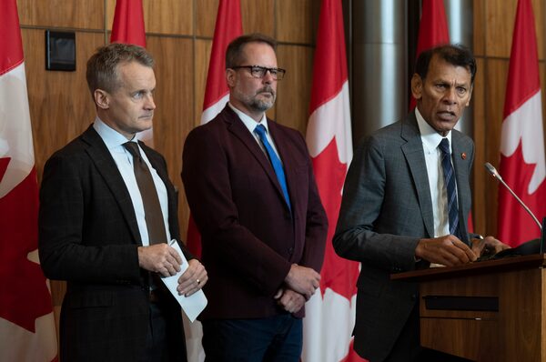Labour Minister Seamus O’Regan and NDP MP Alexandre Boulerice look on as Senator Hassan Yussuff speaks during a news conference.Adrian Wyld/The Canadian Press