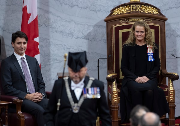 Governor-General Julie Payette and Prime Minister Justin Trudeau watch as Usher of the Black Rod Greg Peters leaves to summon members of the House of Commons for the Throne Speech in the Senate chamber, on Dec. 5, 2019 in Ottawa.Adrian Wyld/The Canadian Press