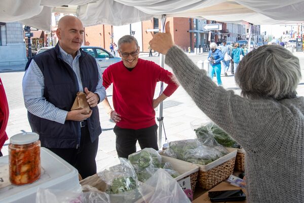 Market vendor Sarah Attwell thanks Ontario Liberal Leader Steven Del Duca for some jams in Kingston, Ont., on May 7.Lars Hagberg/The Canadian Press