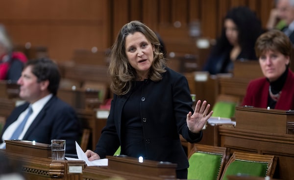 Deputy Prime Minister and Minister of Finance Chrystia Freeland responds to a question during Question Period in the House of Commons Monday November 23, 2020 in Ottawa.Adrian Wyld/The Canadian Press