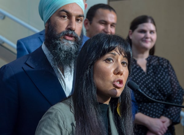 NDP Leader Jagmeet Singh looks on as then-Winnipeg Centre candidate Leah Gazan addresses supporters during a campaign stop at the University of Manitoba in Winnipeg on Sept. 24, 2019.Andrew Vaughan/The Canadian Press