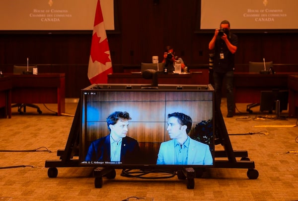 Marc Kielburger, screen left, and Craig Kielburger, right, appear as witnesses via videoconference during the House of Commons finance committee, in Ottawa on July 28, 2020.The Canadian Press