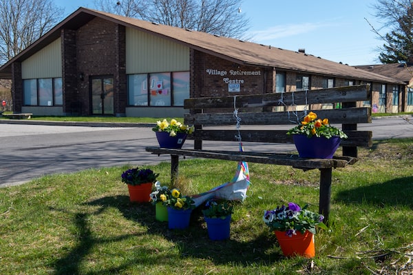 Flowers sit on a bench in front of Orchard Villa long-term care home in Pickering, Ont. on April 27, 2020.Frank Gunn/The Canadian Press
