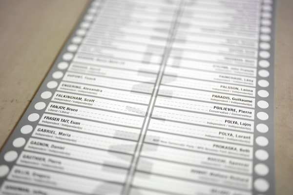 An example of a ballot for the Carleton riding is seen at the Elections Canada Distribution Centre in Ottawa on the day of the federal election, April 28.Justin Tang/The Canadian Press