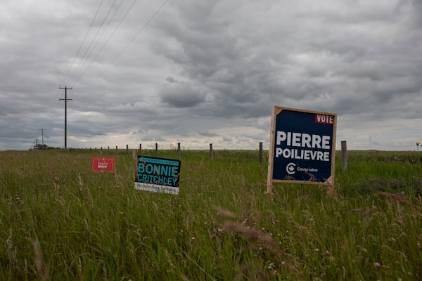 Campaign signs for Independent candidate Bonnie Critchley, Pierre Poilievre and Darcy Spady in the riding of Battle River-Crowfoot in Camrose, Alta., on July 22. Elections Canada decided to switch to a write-in ballot to deal with the unusually large number of candidates.AMBER BRACKEN/The Canadian Press