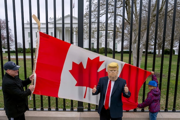 This Toronto father and son, vacationing in Washington in early March, showed their support for Canada's side in the tariff dispute with a flag and a hockey stick. Canadian delegates were in the capital that day for talks on how to de-escalate the trade war.Ben Curtis/The Associated Press