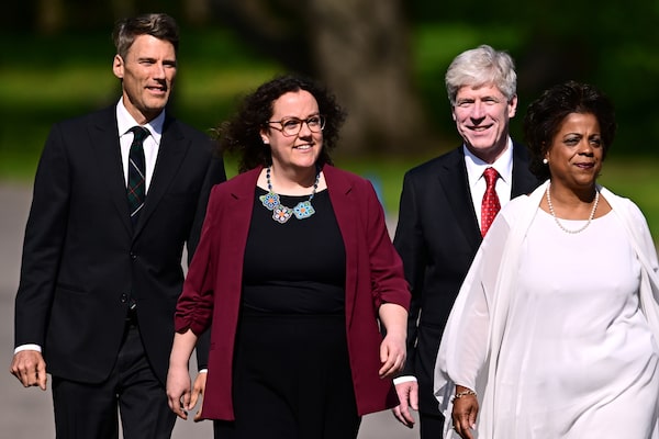 Gregor Robertson, left to right, Rebecca Alty, Tim Hodgson, Marjorie Michel arrive for a cabinet swearing-in at Rideau Hall in Ottawa on Tuesday, May 13, 2025. THE CANADIAN PRESS/Spencer ColbySpencer Colby/The Canadian Press