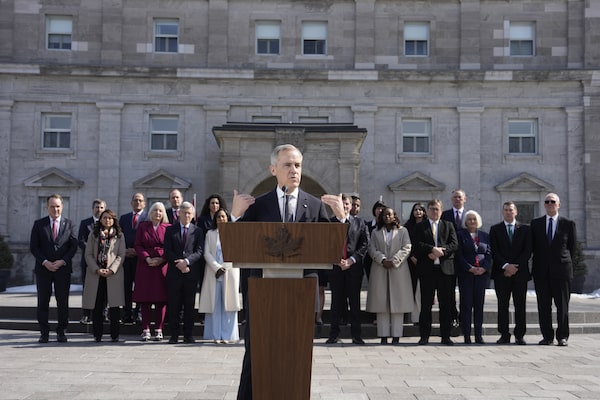 Prime Minister Mark Carney holds a press conference as members of his cabinet look on following a swearing in ceremony at Rideau Hall in Ottawa.Adrian Wyld/The Canadian Press