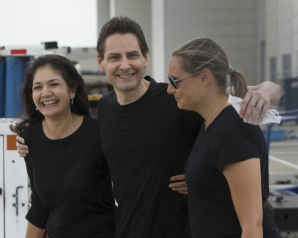 She and Mr. Kovrig’s sister, Ariana, were at the Skyservice terminal to greet him as he departed the plane Saturday afternoon. The trio wandered over to a cluster of reporters gathered outside the terminal for a few brief minutes before leaving in a black SUV.