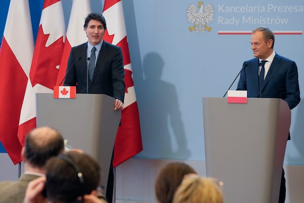 Prime Minister Justin Trudeau and Poland's Prime Minister Donald Tusk address the media following their talks, on European security and support for Poland's neighbor, Ukraine, in its struggle against Russia's aggression, in Warsaw, on Feb. 26.Czarek Sokolowski/The Associated Press