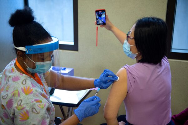 Limin Liu, a registered nurse, takes a selfie while Sasha Vartley administers the Pfizer-BioNTech COVID-19 vaccine at a UHN pilot site in downtown Toronto on Dec. 15, 2020.Fred Lum/The Globe and Mail
