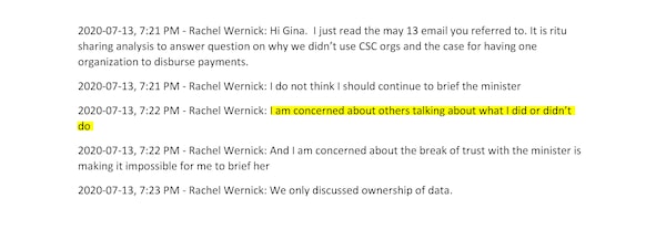 What appears to be messages between officials after the program is cancelled. Wernick starts to worry about her conduct.